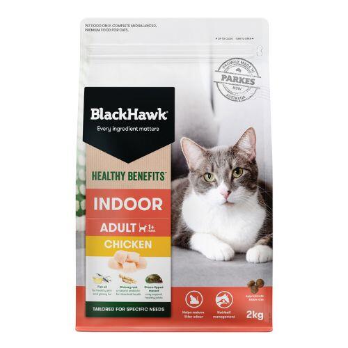 Black Hawk Adult Cat Healthy Benefits Indoor Dry Food helps to minimise litter odour and encourage healthy weight management, specifically designed for indoor cats. Product details Includes yucca extract to minimise stool odour high-fibre ingredients to help minimise hairball formation filled with quality proteins to encourage healthy weight management packed with the amino acids essential for building strong bones and muscles contains natural sources of glucosamine, omega-3 and omega-6 fatty acids which may help support healthy joints