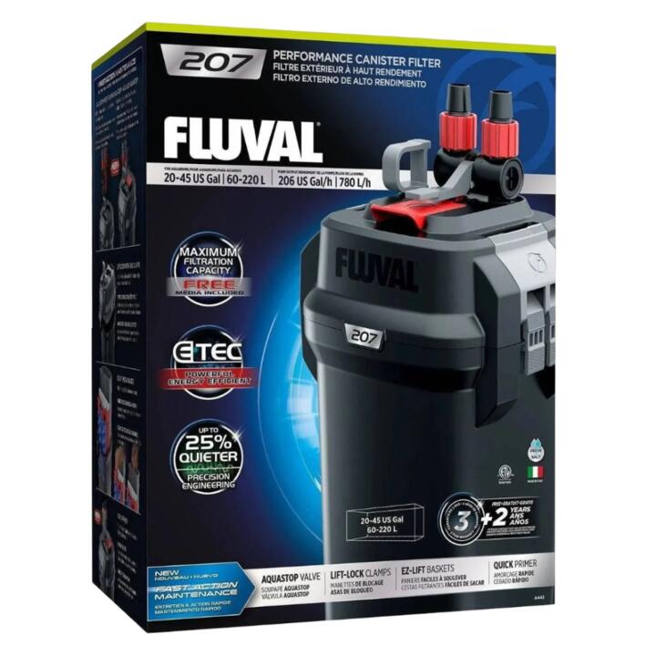 The Fluval 207 Canister Filter is a high-performance external filter for 60-220 litre (20-45 US gal) aquariums. Featuring eTEC (Efficient Technology), it runs up to 25% quieter with powerful, consistent flow (780 L/h) while consuming only 10 watts. It provides complete multi-stage filtration (mechanical, chemical, biological) for clear, healthy water, with user-friendly maintenance features like EZ-Lift media baskets and an AquaStop valve.