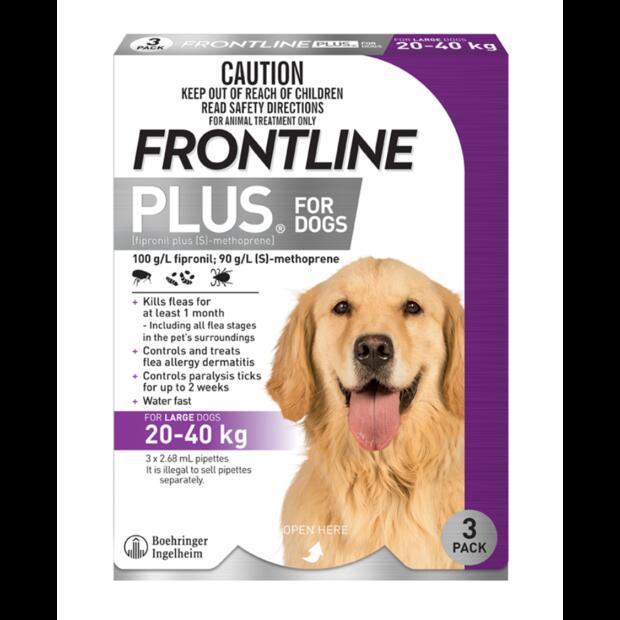 Frontline Plus Purple is the go-to solution for large dogs weighing 20-40kg to fend off fleas, ticks, and lice. Its specialised formula provides month-long protection, ensuring your canine stays healthy and comfortable.