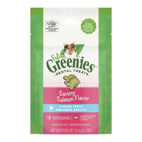 Tasty salmon flavour rolled up in a delicious crunchy biscuit that’s actually good for your cats health? Sign us up! Greenies are the #1 vet recommended dental treat for cats. The unique shape and texture help to reduce tartar, helping to maintain good dental health for your cat. Product details Contain no artificial flavors or preservatives have only 1.25 calories per piece help your cat maintain optimum dental care and overall good health natural formula with added vitamins, minerals, taurine, and chlorophyll for optimum feline health.