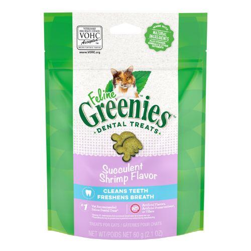 With the Greenies Succulent Shrimp Dental Treats cat dental care is easier and more delicious. You’ll see a difference. Help your cat maintain optimal dental care with the unique teeth-cleaning shape and crunchy texture of FELINE GREENIES Dental Treats. Product details Designed to help keep your cat’s teeth clean and healthy unique teeth-cleaning shape and crunchy texture reduces tartar buildup and freshens cat breath great for treat dispensing toys less than 2 calories per treat