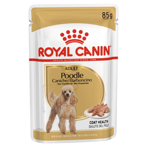ROYAL CANIN Poodle Adult Wet Dog Food is crafted to meet the unique nutritional needs of adult Poodles over 10 months old. With a specially formulated loaf texture, this recipe supports muscle tone, enhances coat health, and appeals even to the fussiest eaters.