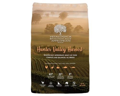 VETALOGICA BIOLIGICALLY APPROPRIATE HUNTER VALLEY HARVEST CAT FOOD 3KGVetalogica Biologically Appropriate Hunter Valley Harvest Adult Cat Food features quality ingredients from local Australian farmers including our hormone-free chicken and duck which is sourced from the Hunter Valley and Regional NSW.Features:Biologically Appropriate Cat Food65% meat and animal ingredientsProudly Australian with 100% of meats sourced locally4 different meat sourcesBalanced with essential oils, vitamins and mineralsNo grains or artificial nastiesGluten free No GMOsIngredients:Australian meat and animal ingredients 65% including: Chicken Meal, Duck Meal, Tuna Meal, Mackerel Meal, Sweet Potatoes, Chickpeas, Green Lentils, Red Lentils, Chicken Fat (Naturally preserved with Mixed Tocopherols), Ground Flaxseed, Eggs, Coconut Oil, Kale, Dried Blueberries, Dried Spinach, Tomato Pomace, Dried Pumpkin, Chicory Root, Kelp, Potassium Chloride, Choline Chloride, Sea Salt, Vitamins (Vitamin E Supplement, Niacin (Vitamin B3), Calcium Pantothenate (Vitamin B5), Riboflavin (Vitamin B2), Pyridoxine Hydrochloride (Vitamin B6), Thiamine Mononitrate (Vitamin B1), Folic Acid, Biotin, Vitamin A Supplement, Vitamin B12 Supplement, Vitamin D3 Supplement, Menadione (Vitamin K3), Minerals (Zinc Sulfate, Ferrous Sulfate, Magnesium Oxide, Copper Sulfate, Manganese Oxide, Iodine, Sodium Selenite, Zinc Propionate), Turmeric Root, DL-Methionine, Taurine, Yucca Schidigera Extract, Mixed Tocopherols (a Natural preservative), Rosemary Extract. Feeding Guide:Please refer to the packaging for feeding guide. Always provide fresh, clean water for your pets.